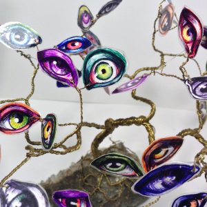 "Bonz'oeil" de la série "Dame nature nous surveille". 56 yeux Recto / Verso, donc 112 yeux dessinés au stylo bille de couleurs sur papier cartonné, puis plastifié au scotch. Tronc et branches en fils de cuivre fixé sur une pierre de Quartz.
