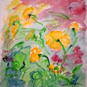 Technique mixte sur toile (acrylique et glycéro, et collages de fleurs en tissu). Cette toile représente le suicide en entreprise, le burn-out souvent décelé trop tard.